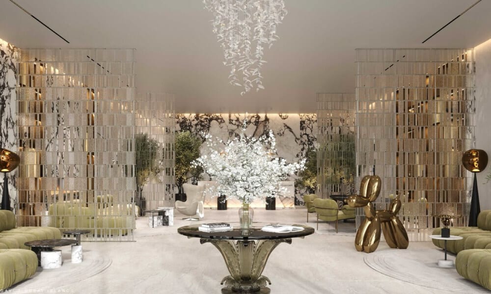 Iconic Lobby & World-Class Interiors: The grand lobby of Villa Del Gavi features a 7-meter ceiling and décor by Cassina, Lalique, and Lasvit, setting a new design benchmark.